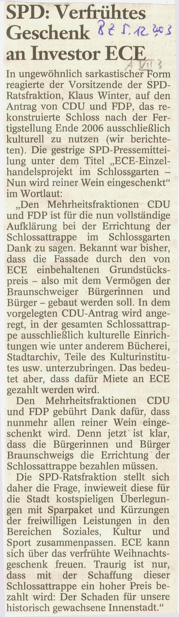 SPD: Verfrühtes Geschenk an Investor ECE Redaktioneller Beitrag vom 05. Dez. 2003 Originaldatei herunterladen …