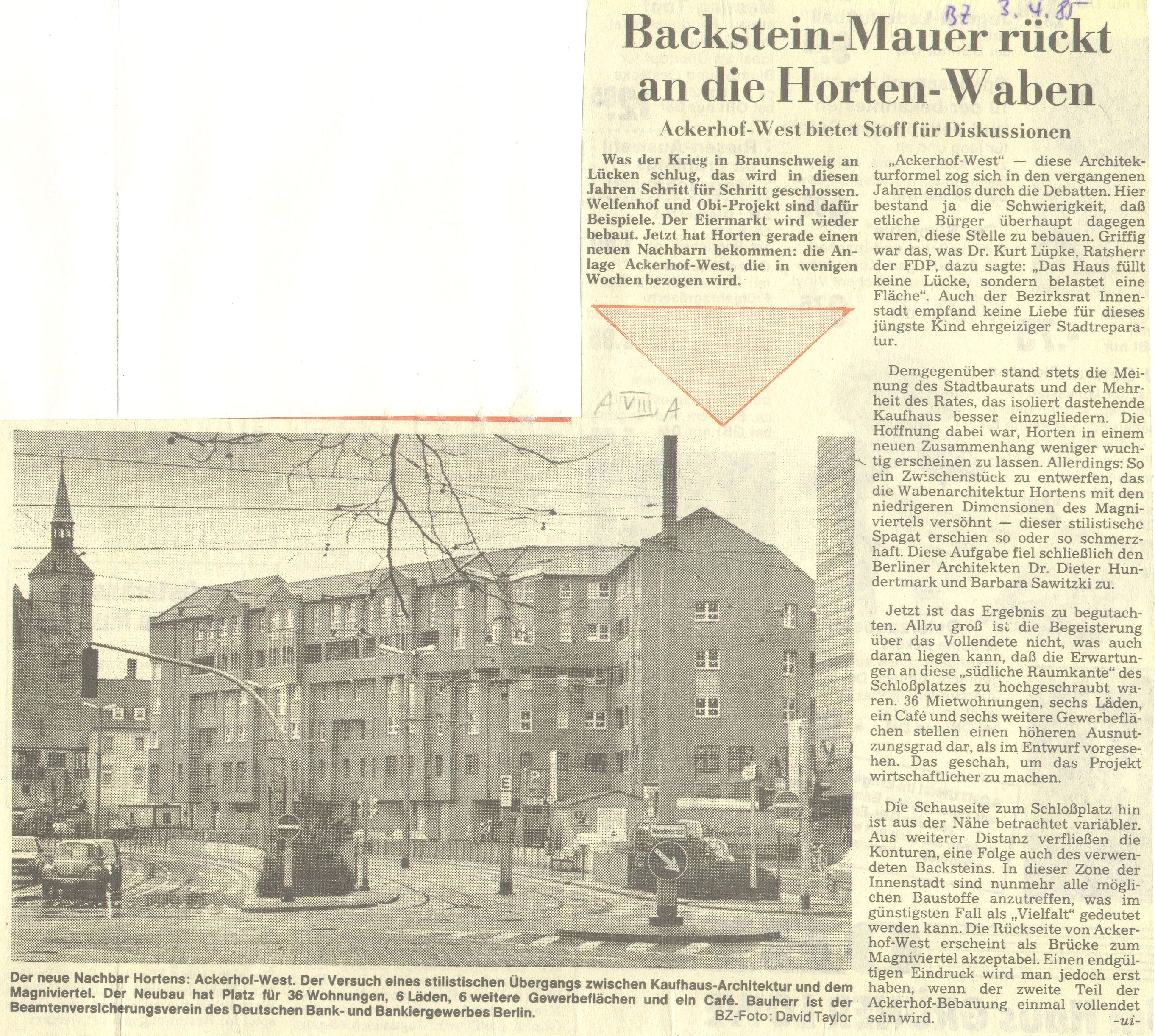 Backsteinmauer rückt an die Horten-Waben Redaktioneller Beitrag vom 03. Apr. 1985 Originaldatei herunterladen …