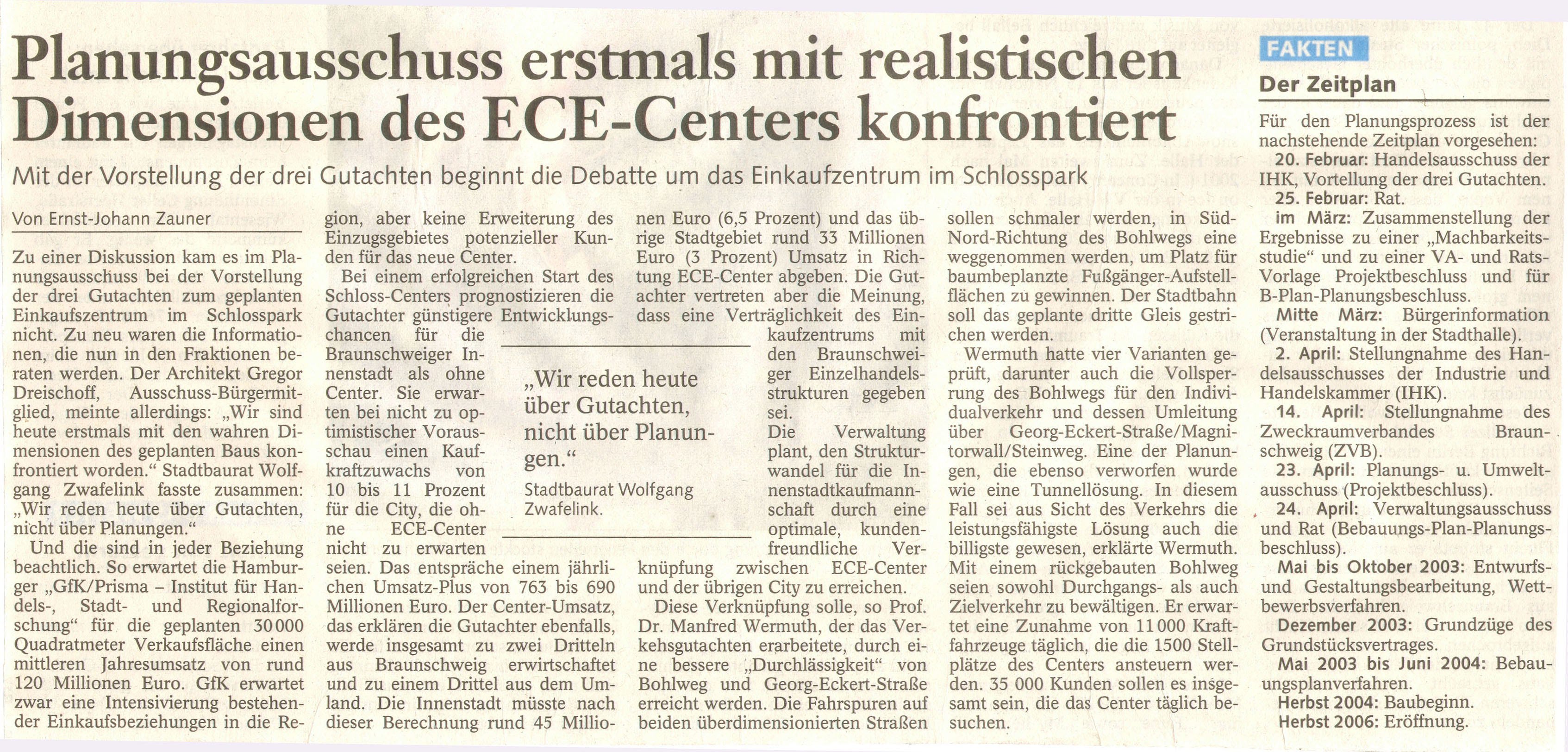 Planungsausschuss erstmals mit realistischen Dimensionen des ECE-Centers konfrontiert Redaktioneller Beitrag vom 20. Feb. 2003 Originaldatei herunterladen …