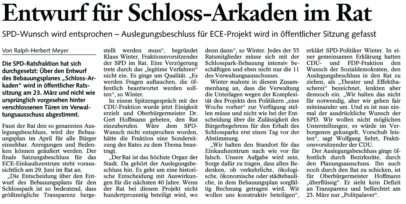 Entwurf für Schloss-Arkaden im Rat Redaktioneller Beitrag vom 09. März 2004 Originaldatei herunterladen …