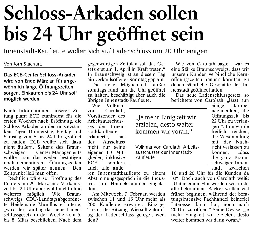 Schloss-Arkaden sollen bis 24 Uhr geöffnet sein Redaktioneller Beitrag vom 26. Jan. 2007 Originaldatei herunterladen …