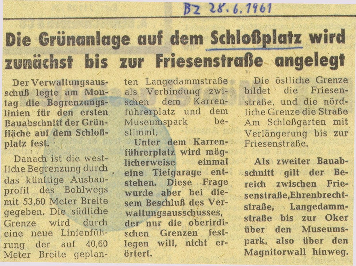 Die Grünanlage auf dem Schloßplatz wird zunächst bis zur Friesenstraße angelegt Redaktioneller Beitrag vom 28. Juni 1961 Originaldatei herunterladen …