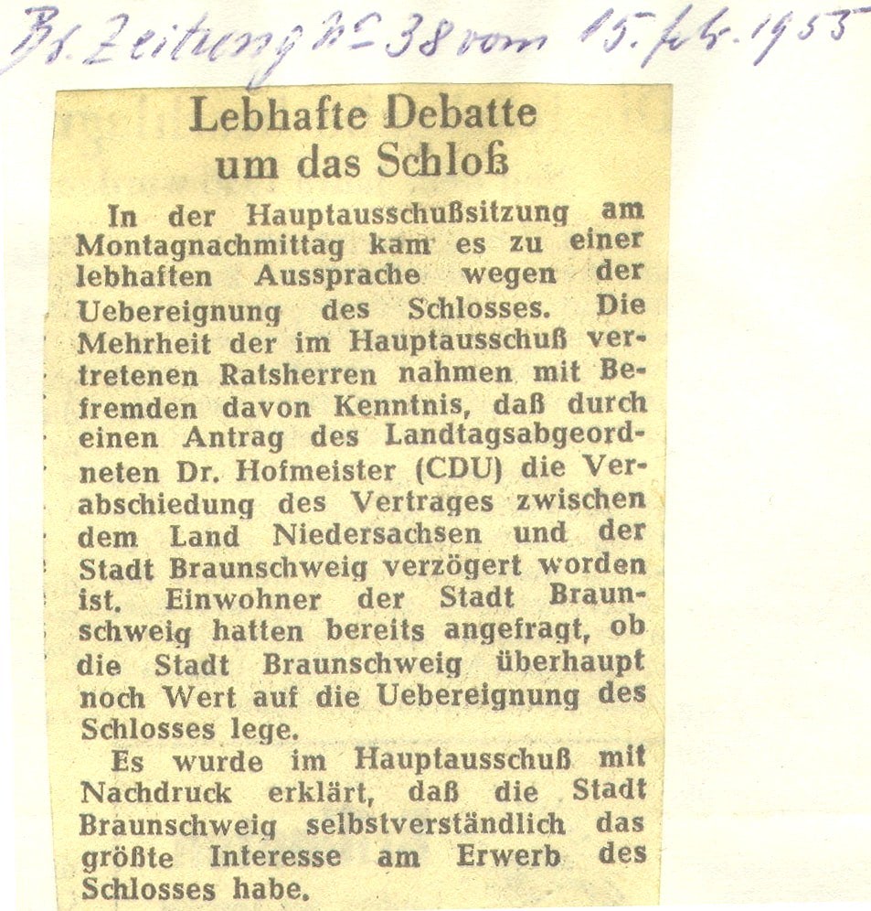 Lebhafte Debatte um das Schloß Redaktioneller Beitrag vom 15. Feb. 1955 Originaldatei herunterladen …