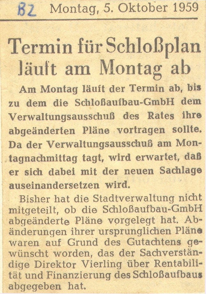 Termin für Schlossplan läuft am Montag ab Redaktioneller Beitrag vom 05. Okt. 1959 Originaldatei herunterladen …