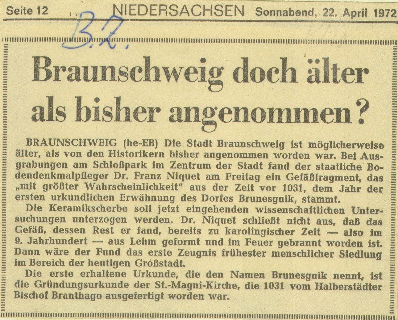 Braunschweig doch älter als bisher angenommen? Redaktioneller Beitrag vom 22. Apr. 1972 Originaldatei herunterladen …
