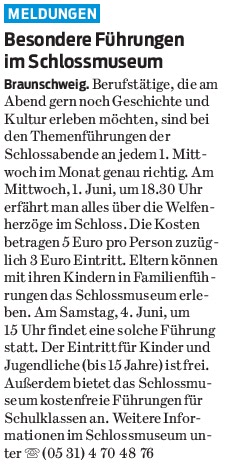 Besondere Führungen im Schlossmuseum Redaktioneller Beitrag vom 30. Mai 2016 Originaldatei herunterladen …