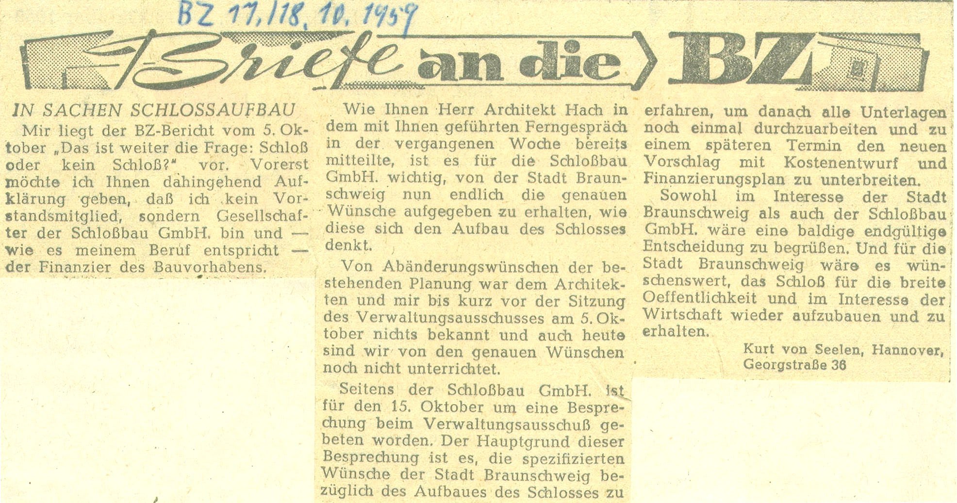 Briefe an die BZ „In Sachen Schlossaufbau“ Redaktioneller Beitrag vom 17. Okt. 1959 Originaldatei herunterladen …