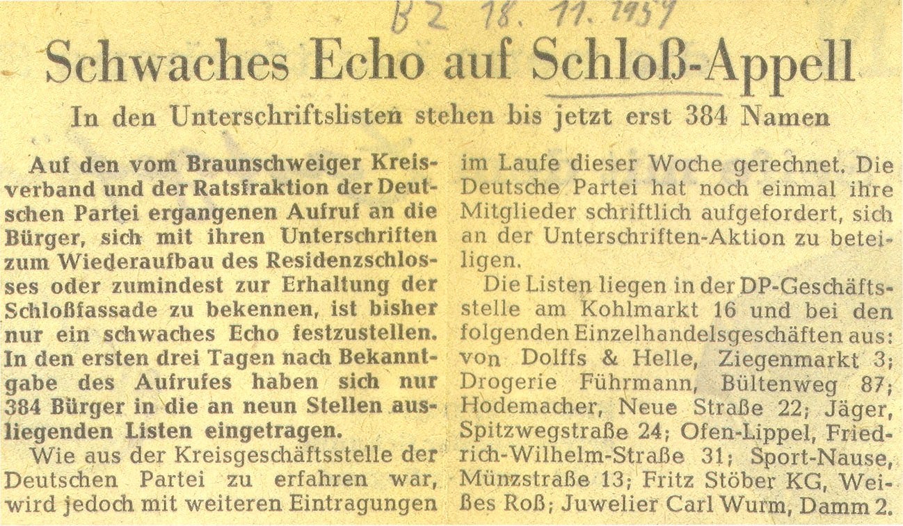 Schwaches Echo auf Schloss-Appell Redaktioneller Beitrag vom 18. Nov. 1959 Originaldatei herunterladen …