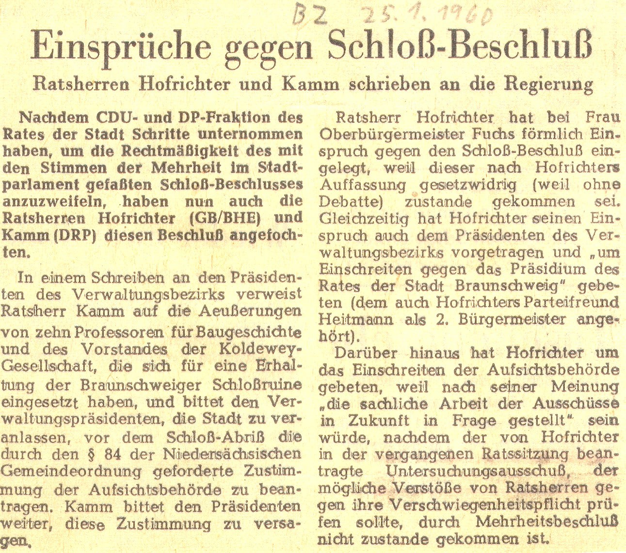 Einsprüche gegen Schloss-Beschluss Redaktioneller Beitrag vom 25. Jan. 1960 Originaldatei herunterladen …