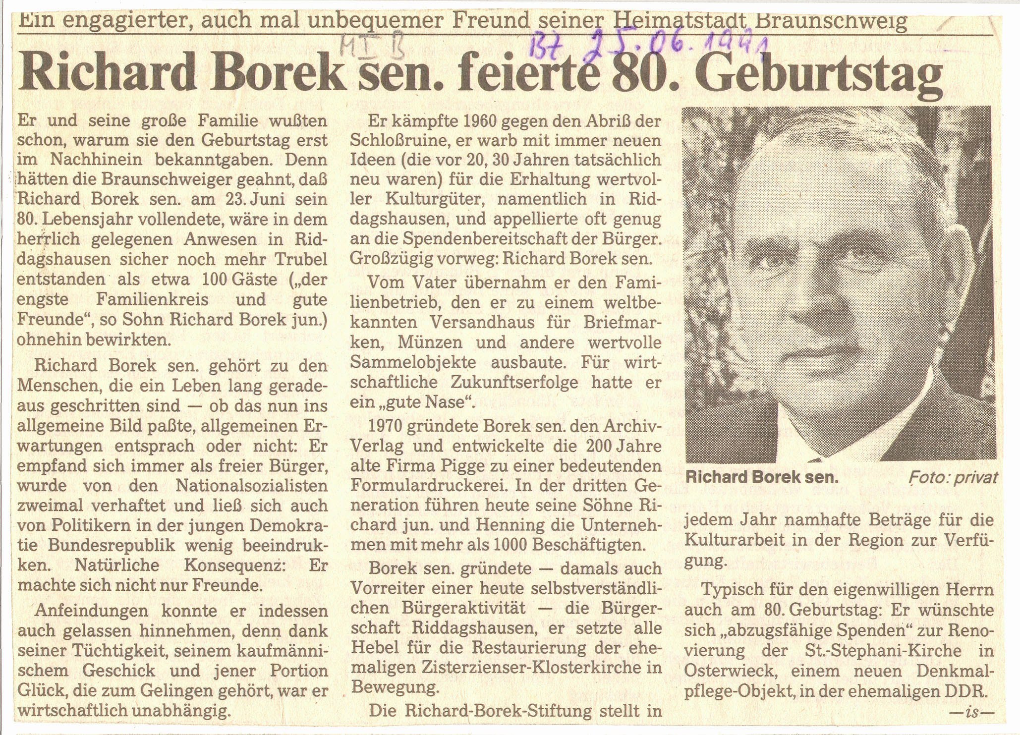 Richard Borek sen. feierte 80. Geburtstag Redaktioneller Beitrag vom 25. Juni 1991 Originaldatei herunterladen …