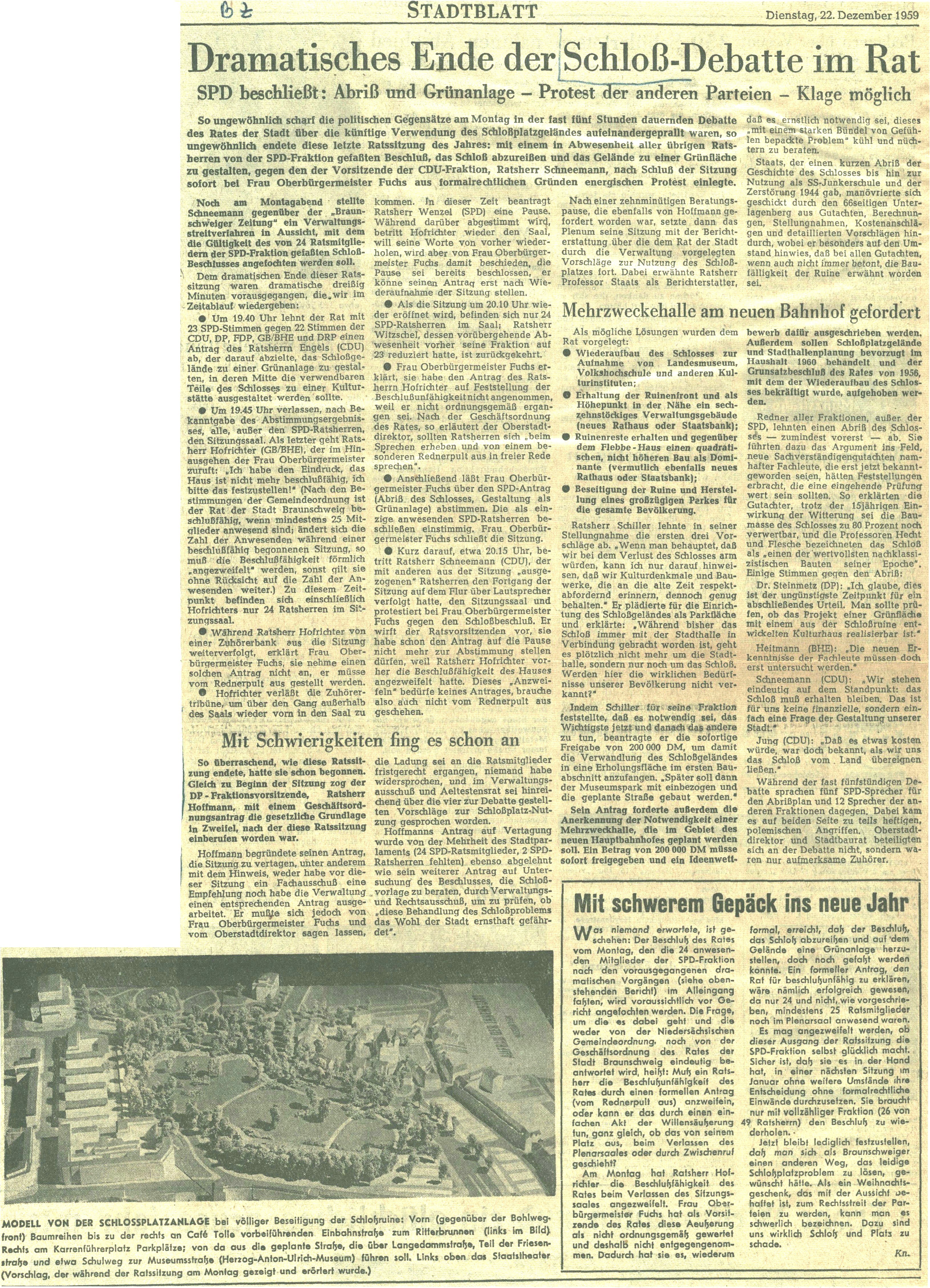 Dramatisches Ende der Schloss-Debatte im Rat (ganze Seite) Redaktioneller Beitrag vom 22. Dez. 1959 Originaldatei herunterladen …