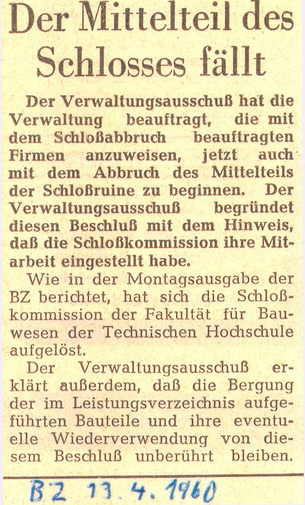Der Mittelteil des Schlosses fällt Redaktioneller Beitrag vom 13. Apr. 1960 Originaldatei herunterladen …