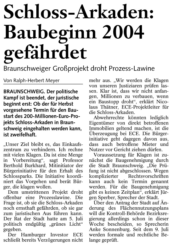 Schloss-Arkaden: Baubeginn 2004 gefährdet Redaktioneller Beitrag vom 18. Aug. 2004 Originaldatei herunterladen …