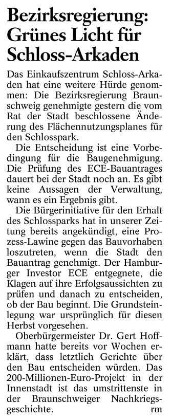 Bezirksregierung: Grünes Licht für Schloss-Arkaden Redaktioneller Beitrag vom 20. Aug. 2004 Originaldatei herunterladen …