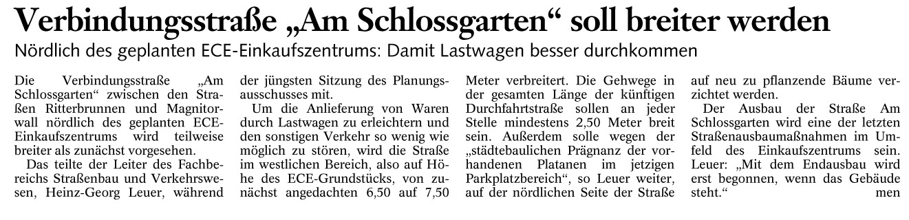 Verbindungsstraße „Am Schlossgarten“ soll breiter werden Redaktioneller Beitrag vom 21. Jan. 2005 Originaldatei herunterladen …