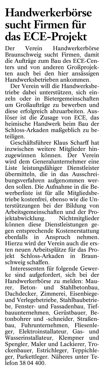Handwerkerbörse sucht Firmen für das ECE-Projekt Redaktioneller Beitrag vom 03. Juni 2005 Originaldatei herunterladen …