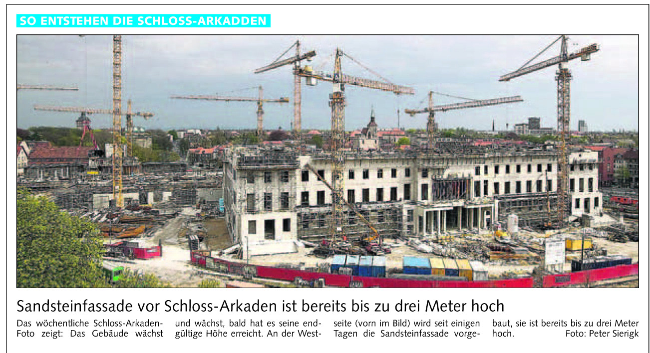 Sandsteinfassade vor Schloss-Arkaden ist bereits bis zu drei Meter hoch Redaktioneller Beitrag vom 29. Apr. 2006 Originaldatei herunterladen …