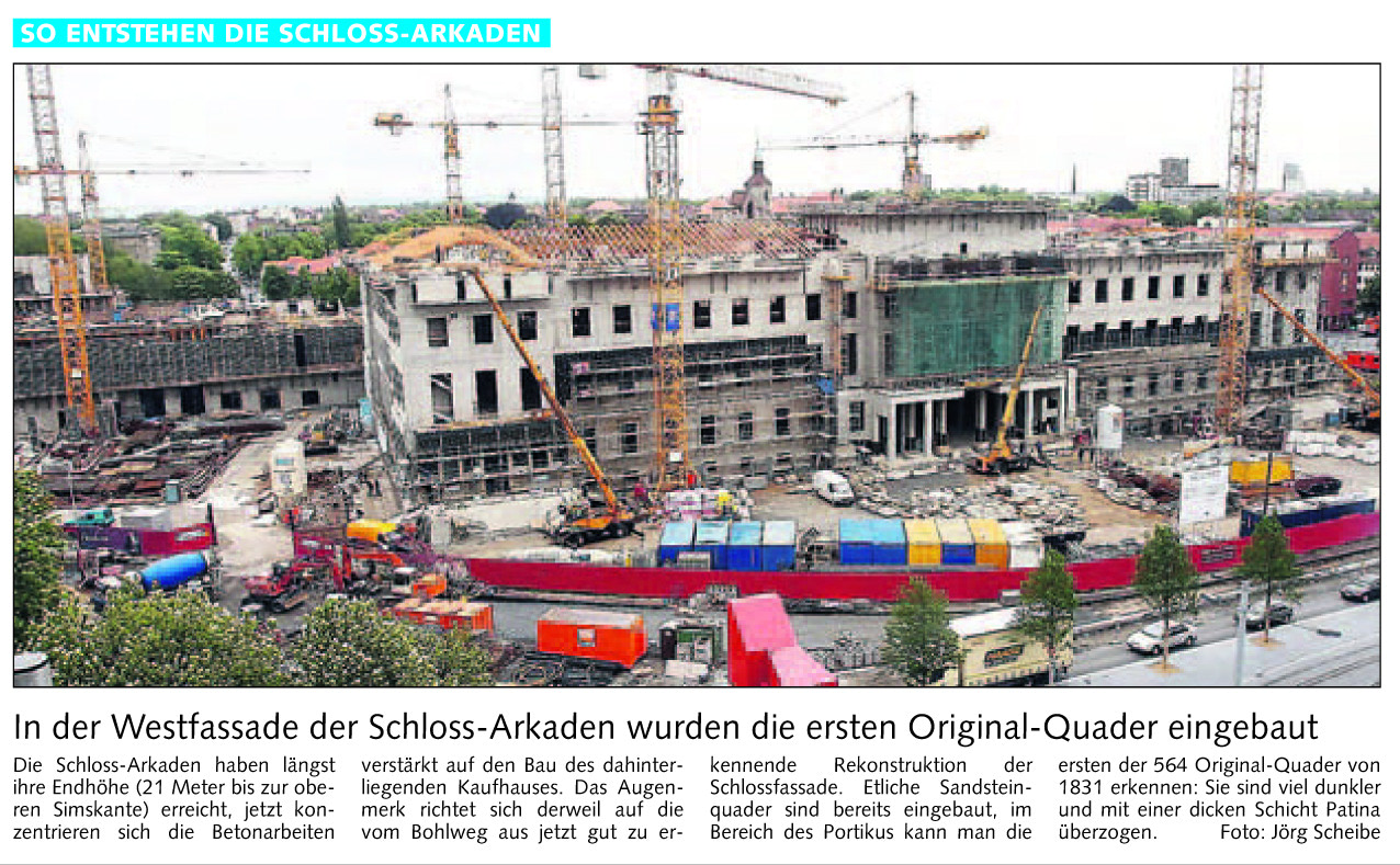 In der Westfassade der Schloss-Arkaden wurden die ersten Original-Quader eingebaut Redaktioneller Beitrag vom 20. Mai 2006 Originaldatei herunterladen …