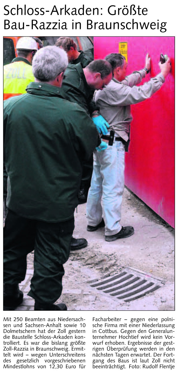 Schloss-Arkaden: Größte Bau-Razzia in Braunschweig Redaktioneller Beitrag vom 24. Mai 2006 Originaldatei herunterladen …