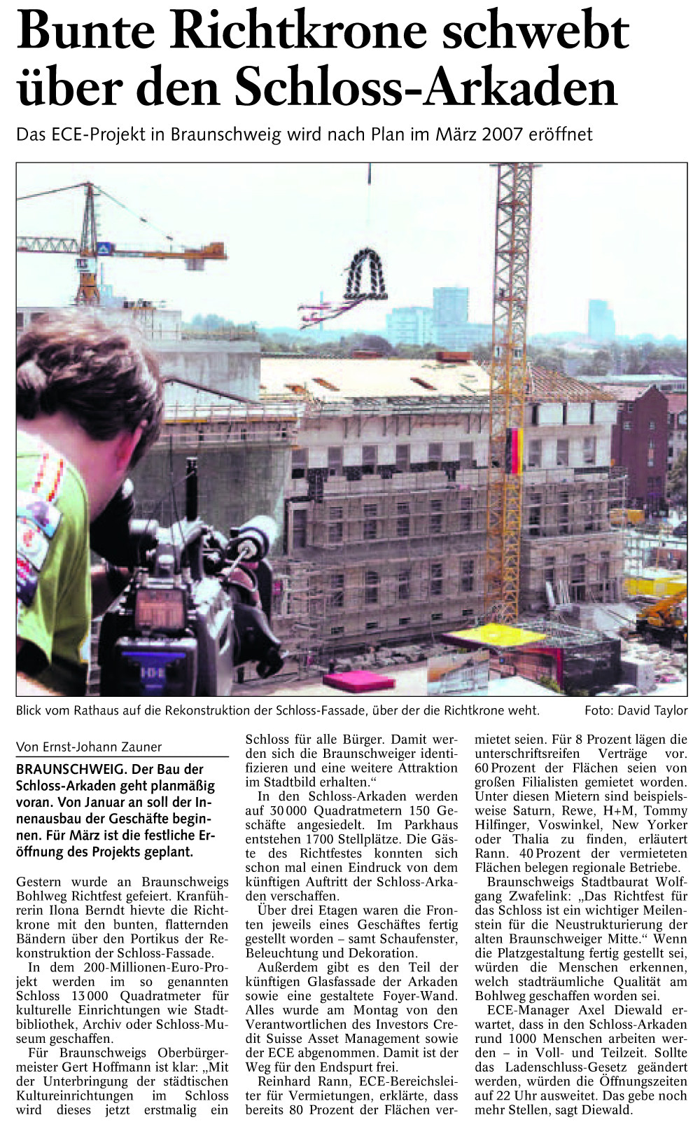 Bunte Richtkrone schwebt über den Schloss-Arkaden Redaktioneller Beitrag vom 28. Juni 2006 Originaldatei herunterladen …