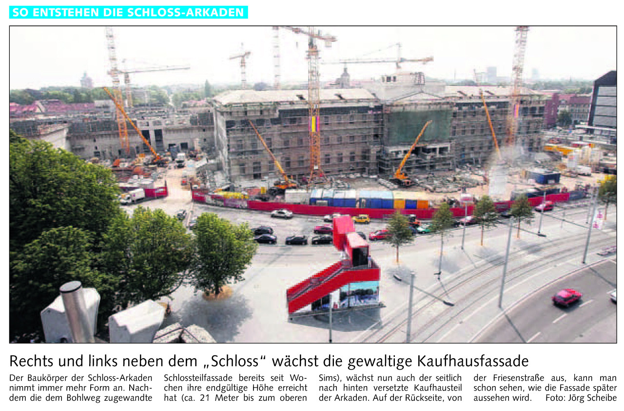Rechts und links neben dem „Schloss“ wächst die gewaltige Kaufhausfassade Redaktioneller Beitrag vom 08. Juli 2006 Originaldatei herunterladen …