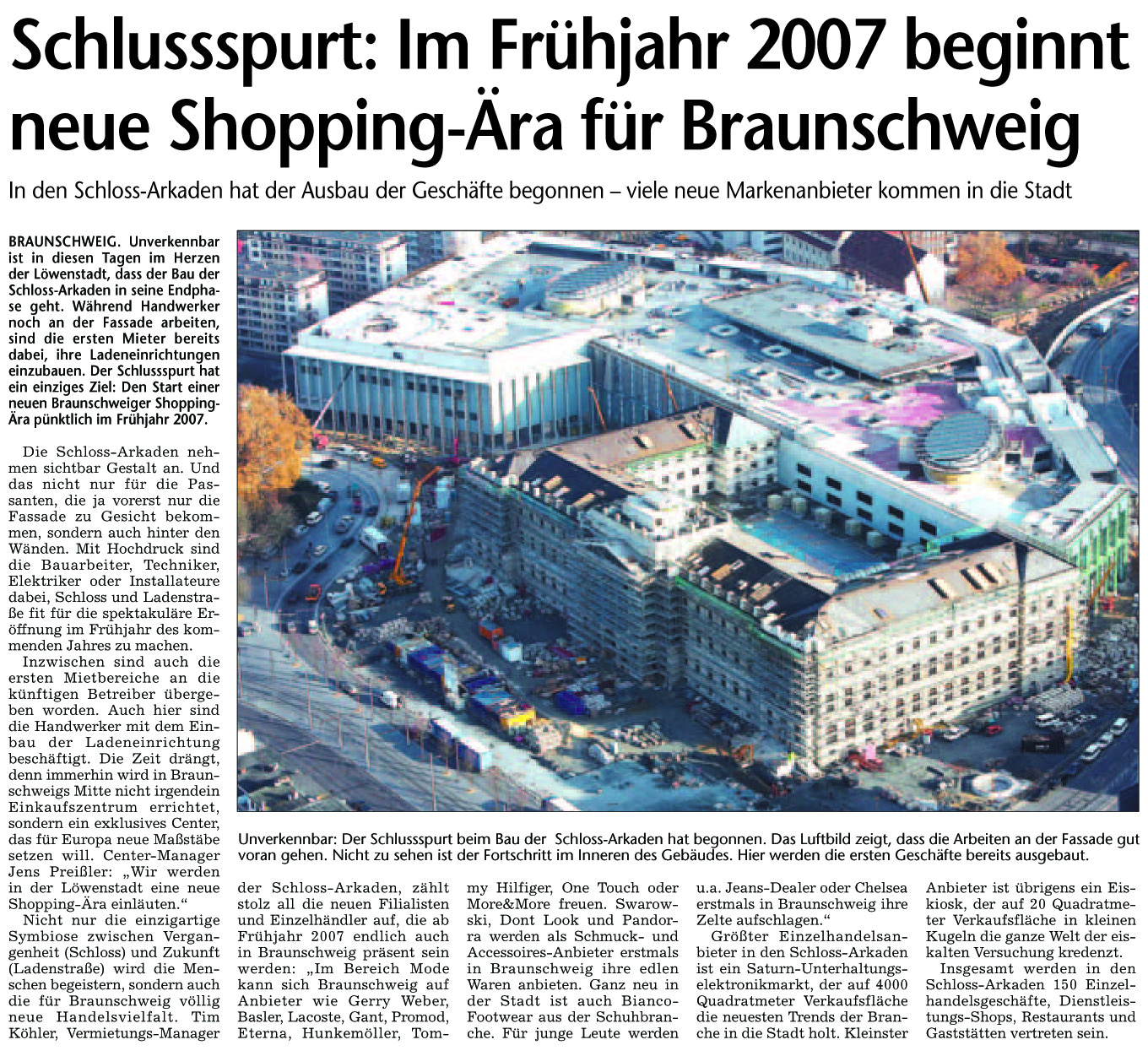 Schlussspurt: Im Frühjahr 2007 beginnt neue Shopping-Ära für Braunschweig Redaktioneller Beitrag vom 16. Dez. 2006 Originaldatei herunterladen …