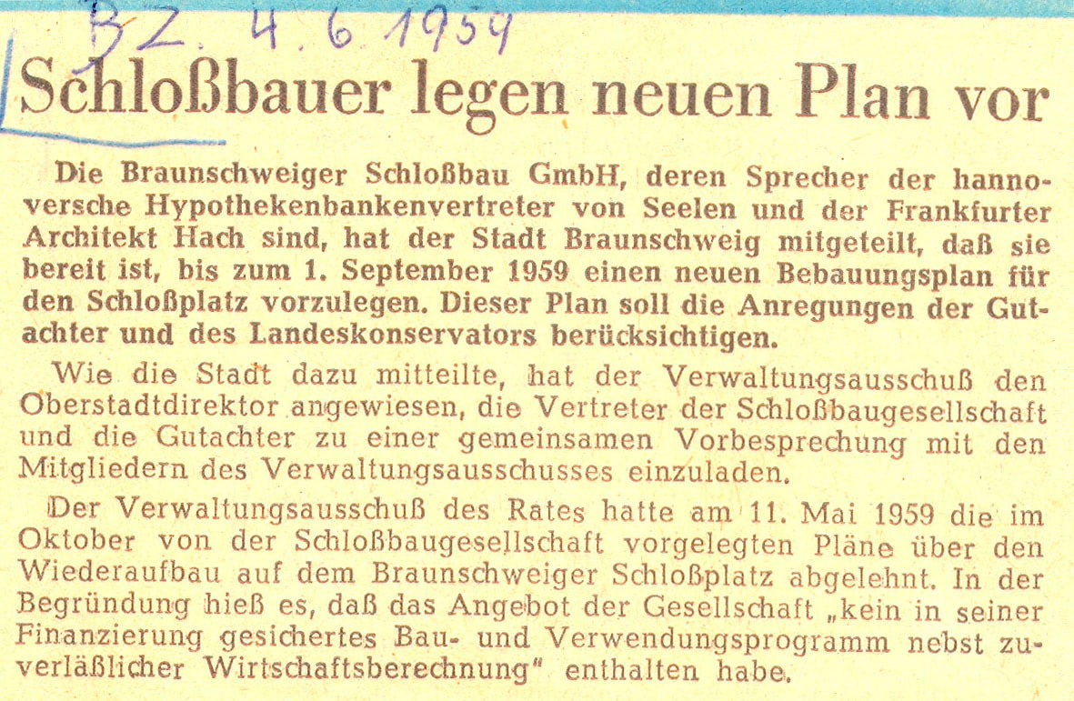 Schlossbauer legen neuen Plan vor Redaktioneller Beitrag vom 04. Juni 1959 Originaldatei herunterladen …