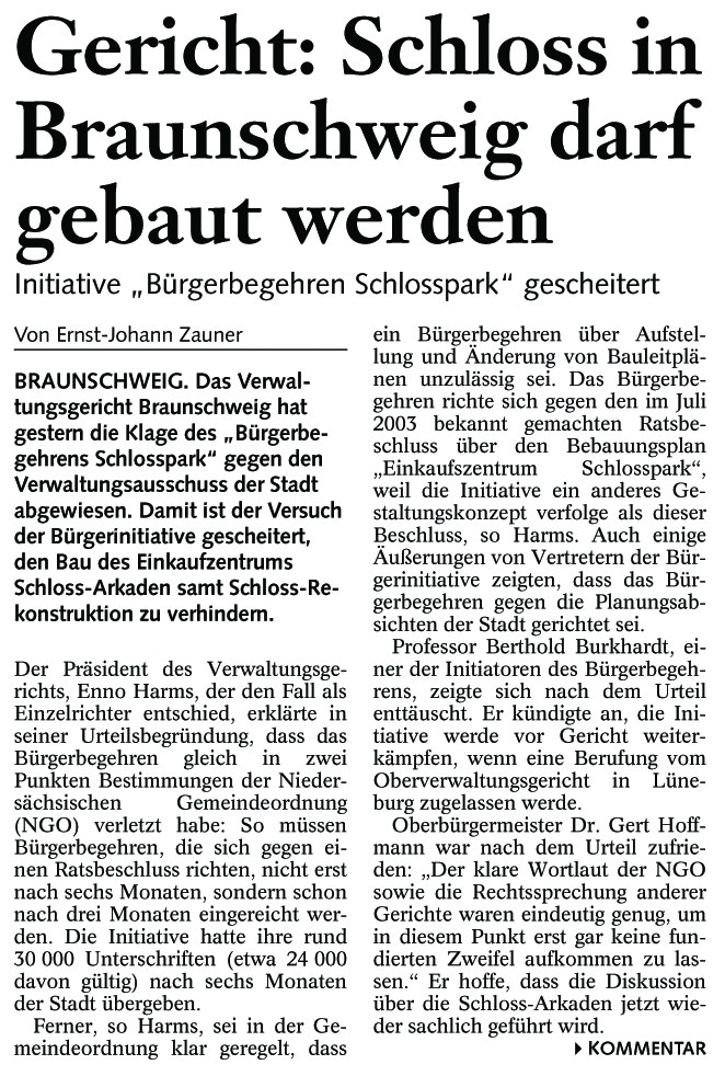 Gericht: Schloss in Braunschweig darf gebaut werden Redaktioneller Beitrag vom 28. Mai 2004 Originaldatei herunterladen …
