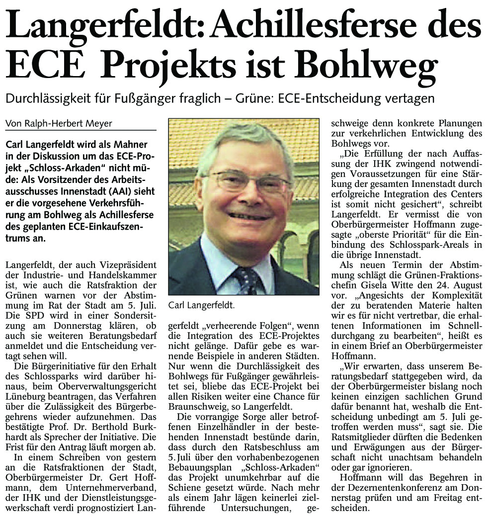 Langerfeldt: Achillesferse des ECE-Projekts ist Bohlweg Redaktioneller Beitrag vom 29. Juni 2004 Originaldatei herunterladen …