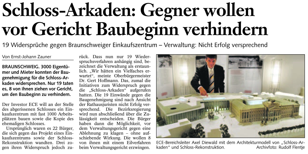 Schloss-Arkaden: Gegner wollen vor Gericht Baubeginn verhindern Redaktioneller Beitrag vom 16. Okt. 2004 Originaldatei herunterladen …